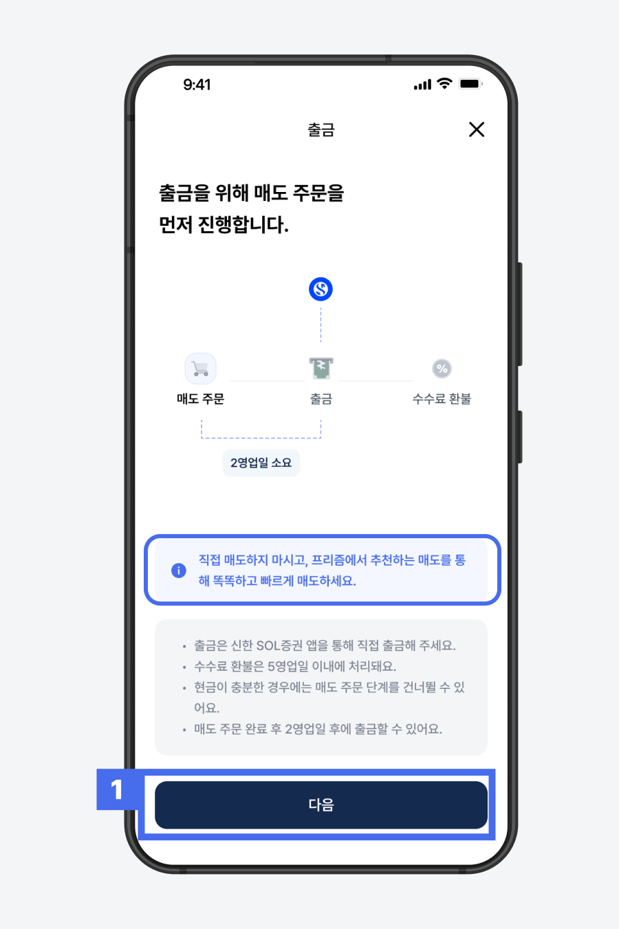 1) 출금 가이드 확인 > ‘다음' 클릭