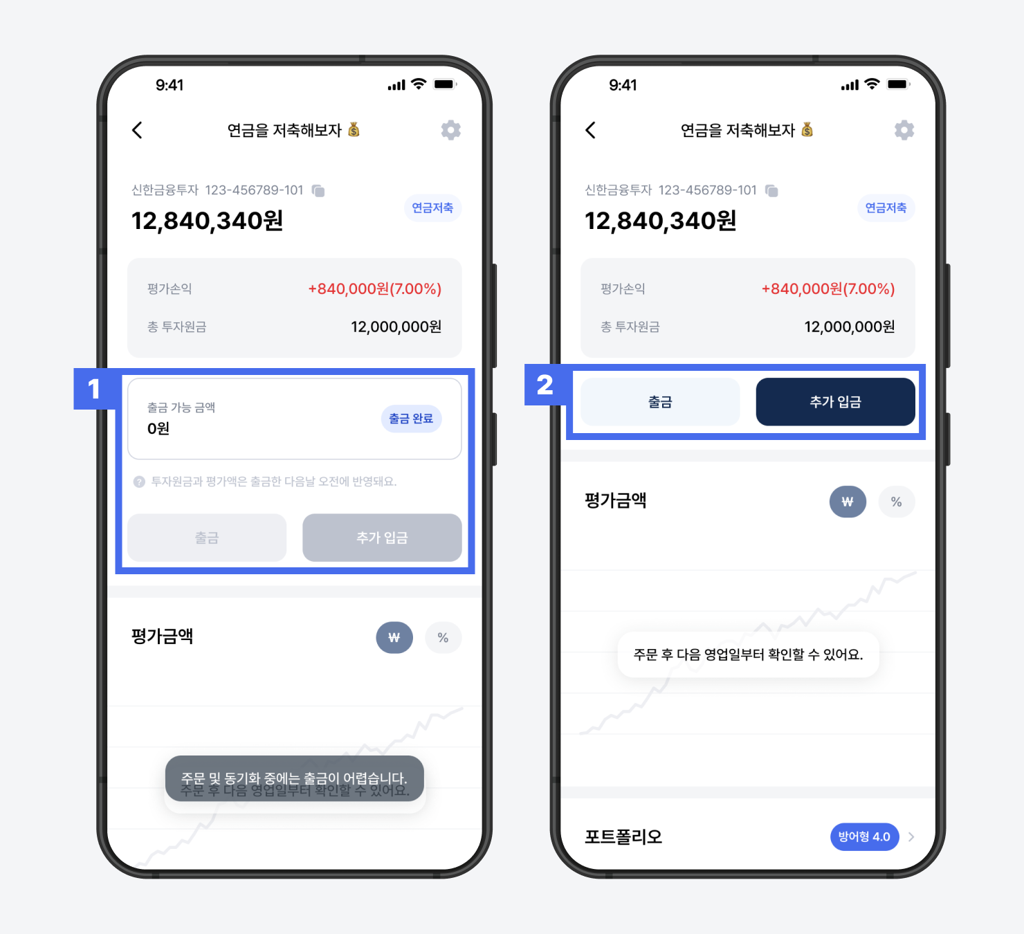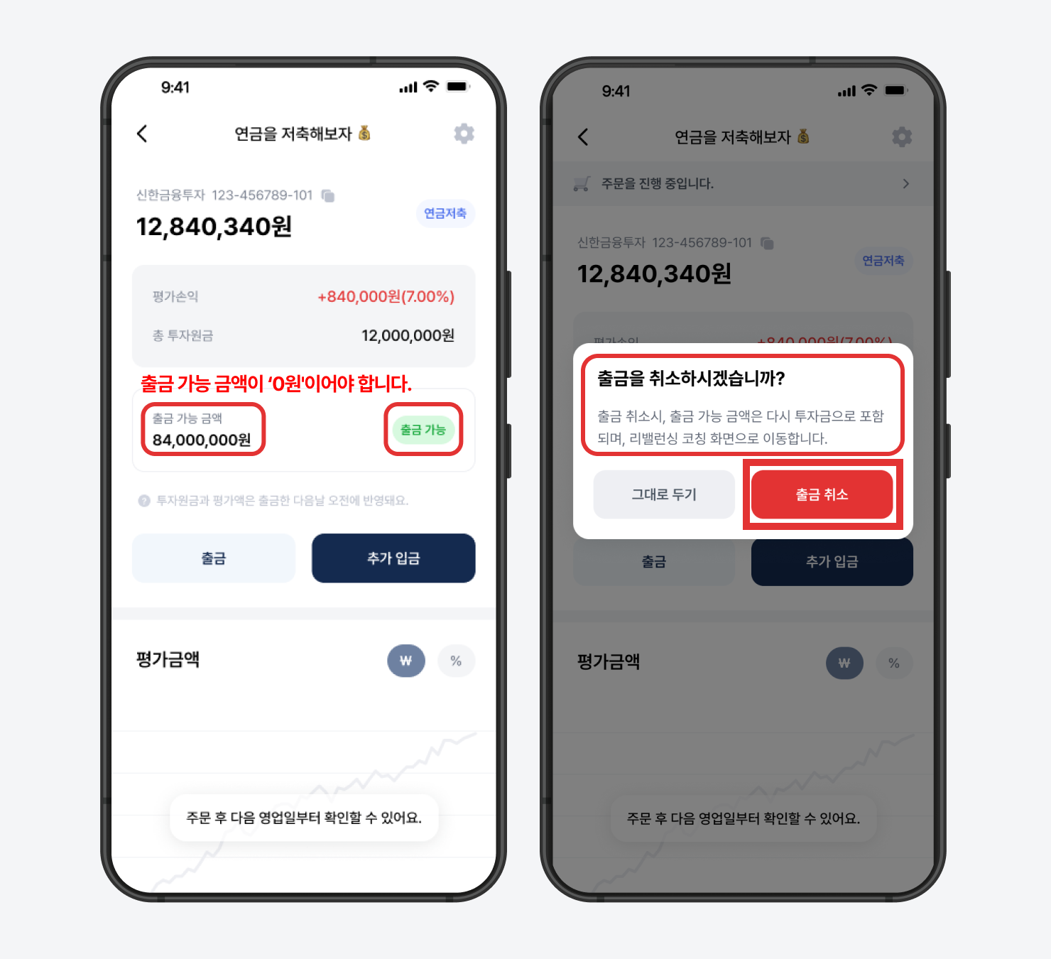 출금 가능 금액이 남아 있는 상태에서는 추가입금과 전략 변경이 진행되지 않습니다.예) 100만 원을 출금 신청후, 신한 SOL증권 앱에서 98만 원만 출금하면 2만 원이 남아 ‘출금 가능’ 상태가 유지됩니다.이 경우 추가입금 및 전략 변경을 진행하려면,