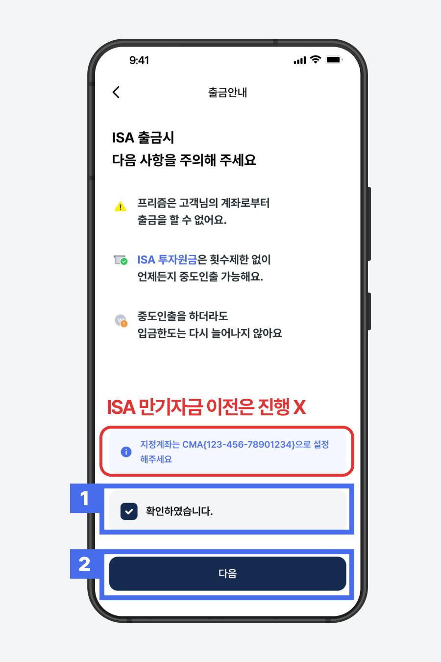 1) ISA 출금 안내 확인 > ‘확인하였습니다.’ 체크박스 클릭