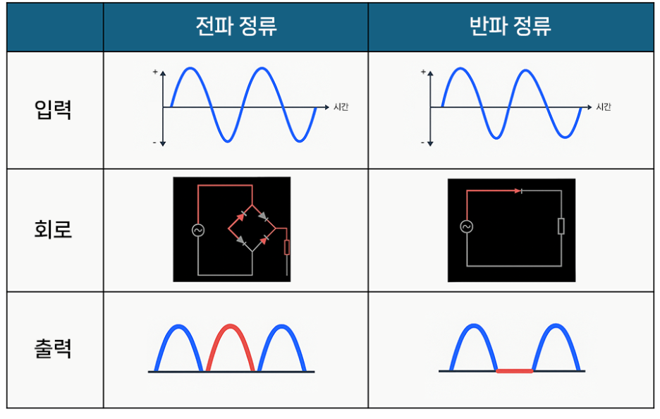 반파 정류 : 음수 구간은 차단되고, 양수 구간의 절반만 사용하여 전류가 흐름 → 출력 낮음, 표기 감지 어려움