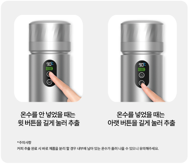 커피 추출 완료 시 바로 제품을 분리할 경우 내부에 남아있는 온수가 흘러 나올 수 있으니 유의해주세요.