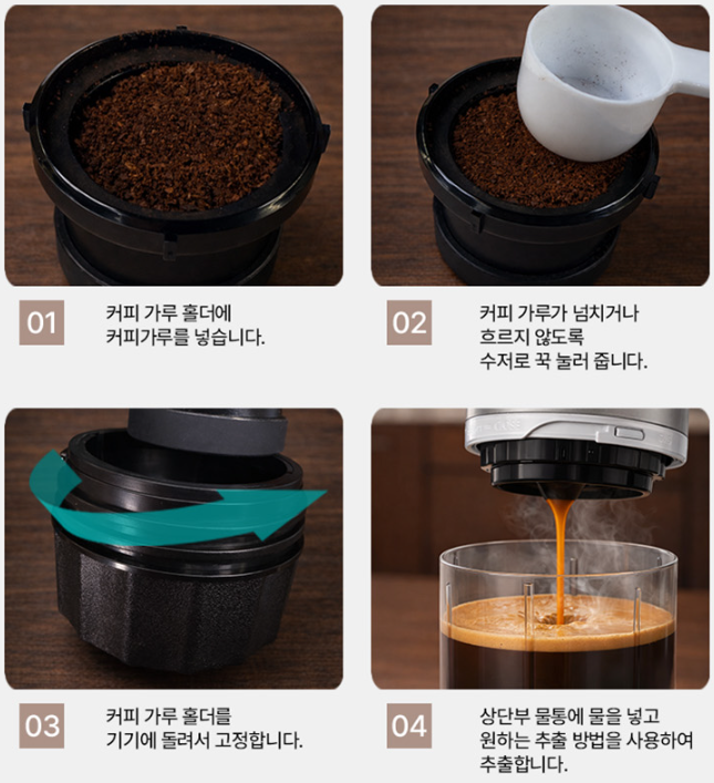 ⚠ 커피가루 사용 시 주의사항- 분쇄도가 너무 고운 원두 사용 또는 권장량 초과 시 추출 중 내부 압력이 높아져 커피가 옆으로 새거나 미세한 가루가 함께 추출될 수 있습니다.- 필터가 제대로 결합되지 않은 경우 결합이 불완전하면 추출 중 누수가 발생할 수 있으니, 사용 전 필터가 끝까지 결합되었는지 확인해 주세요.