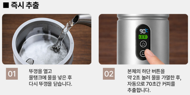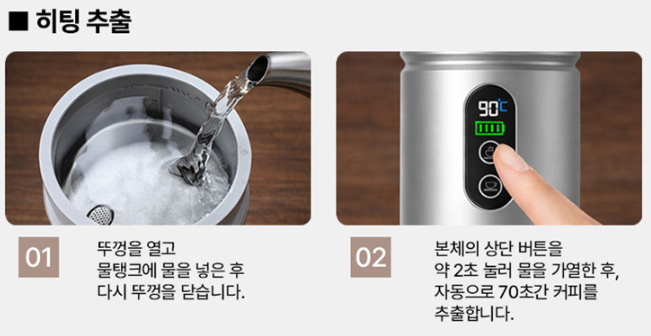 본체의 상단 버튼을 약 2초 눌러 물을 가열한 후, 자동으로 70초간 커피를 추출합니다.