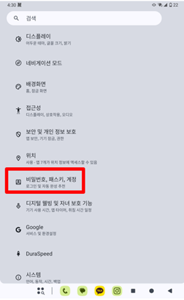"설정" 화면에 진입 하여 “비밀번호, 패스키, 계정” 버튼을 눌러주세요.