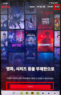 위 설정이 완료된 후 “넷플릭스” 앱 진입하여 하단 “시작하기” 또는 “로그인” 선택해 주세요.