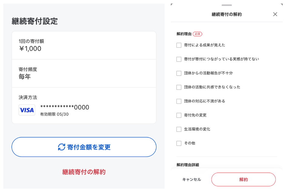 5.継続寄付の解約ボタンからモーダルを開き、解約理由など必須項目にチェックを入れ