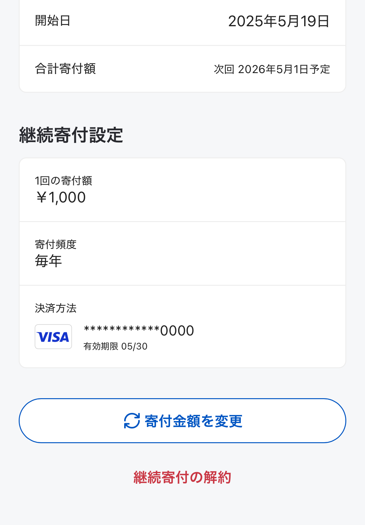寄付金額を変更ボタンからモーダルを開き、ご希望の金額を入力後変更を保存ボタンをタップ次回以降変更後の金額で継続寄付の決済が行われます。