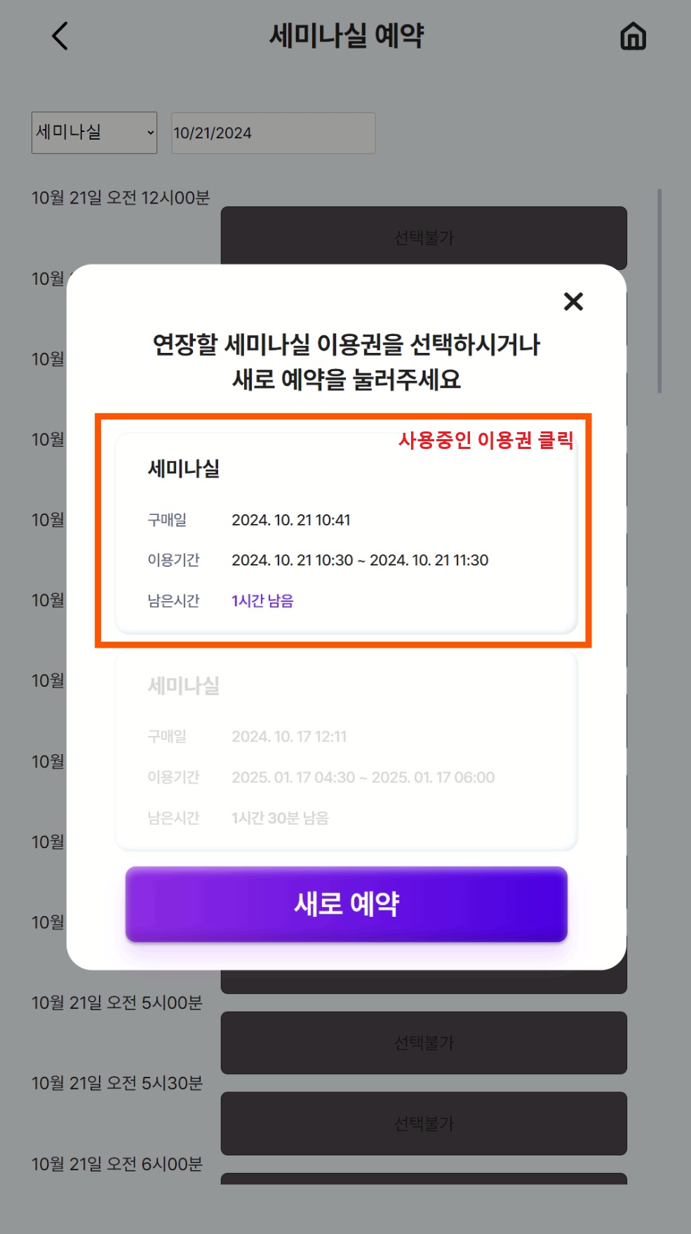 (사용중이어도 무관) 연장 하실 세미나실 이용권을 선택