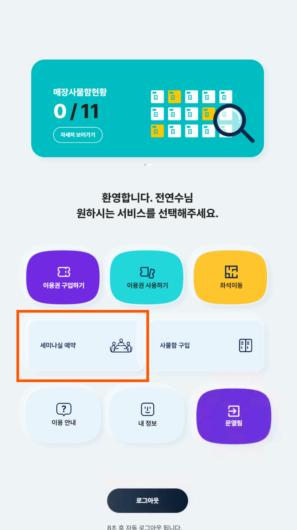 키오스크에서 로그인을 한 뒤, "세미나실 예약" 버튼을 누릅니다.