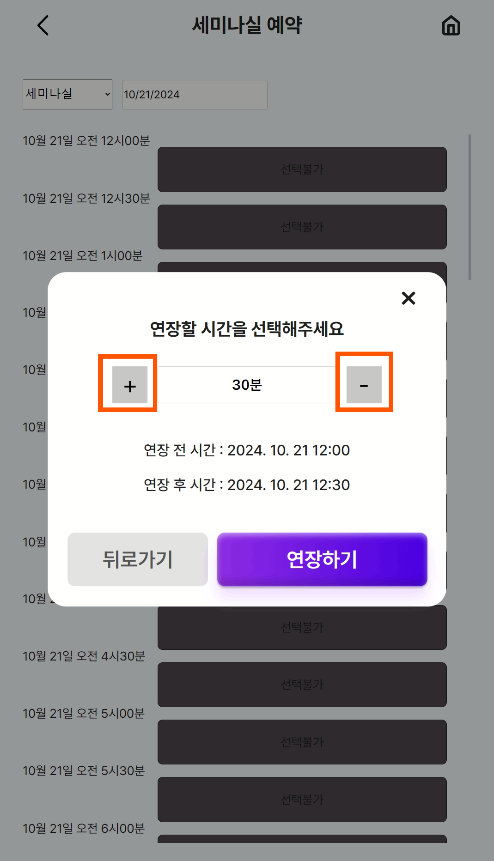 세미나실 이용 시간을 연장할 수 있습니다. (세미나실 이용중에도 가능합니다.)