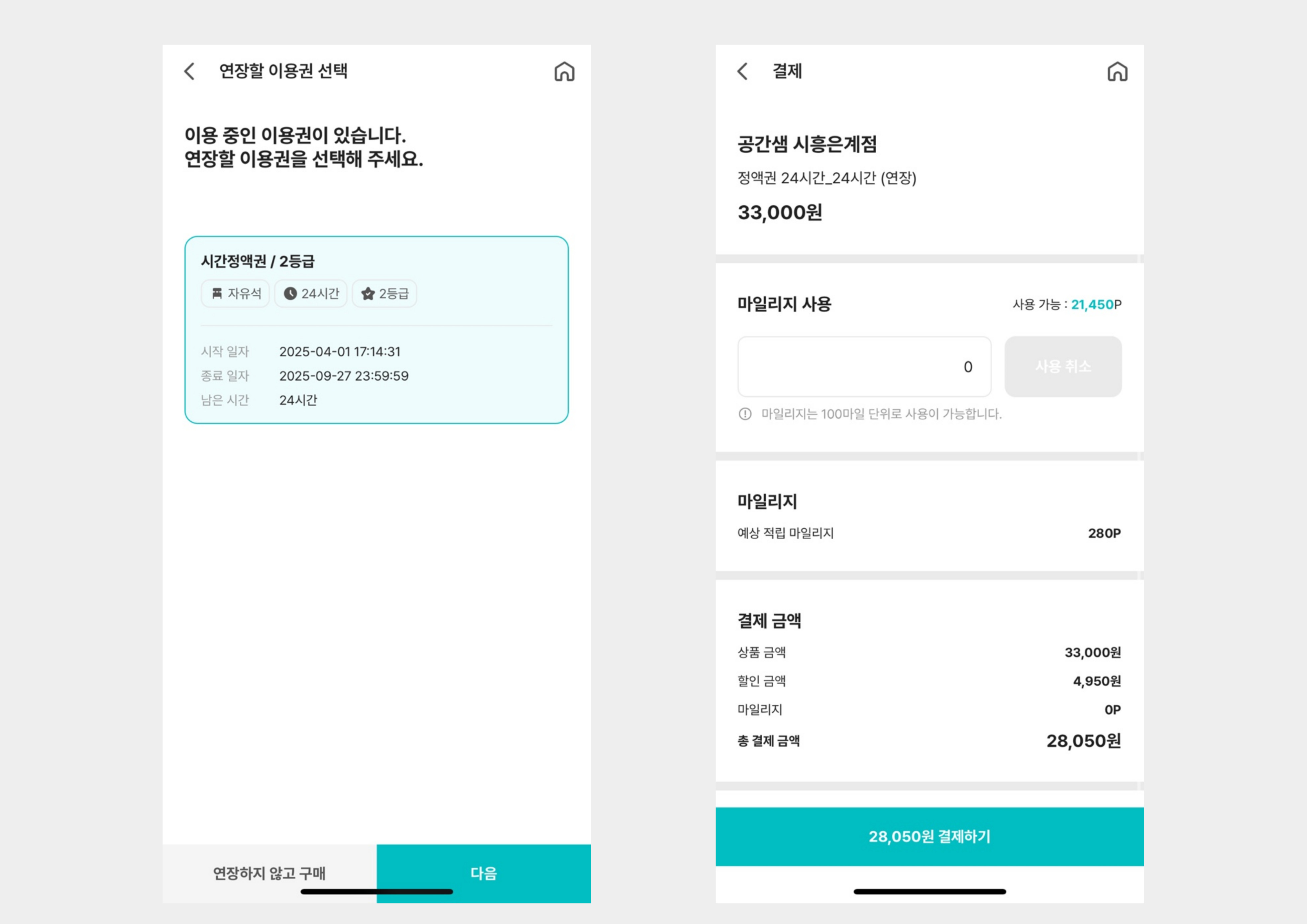 이용권 구매 시, 보유하고 있는 이용권이 있을 경우에 [이용권 연장] 화면이 나타납니다.