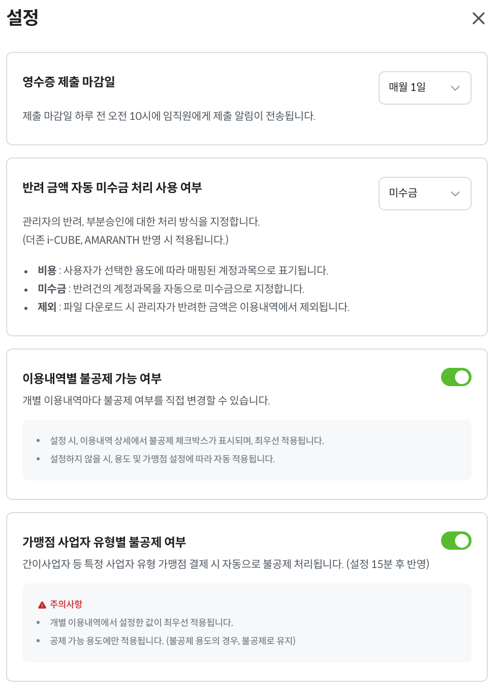 용도별로 사용자가 영수증 제출시 필수로 입력해야 할 정보를 설정할 수 있습니다.