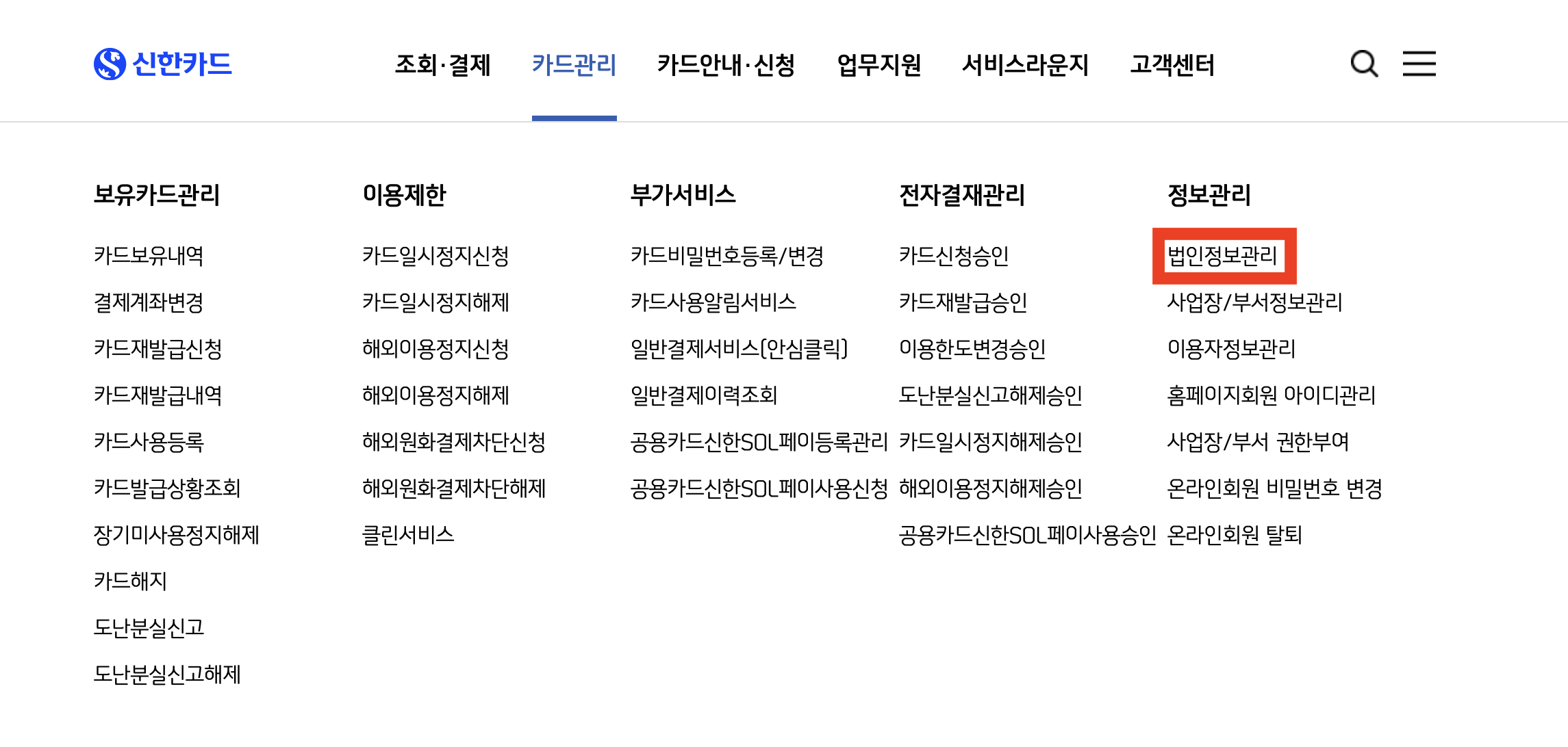 step 3. [카드관리] 메뉴 내 → [정보관리] → [법인정보관리] 클릭 후, 변경 정보 수정