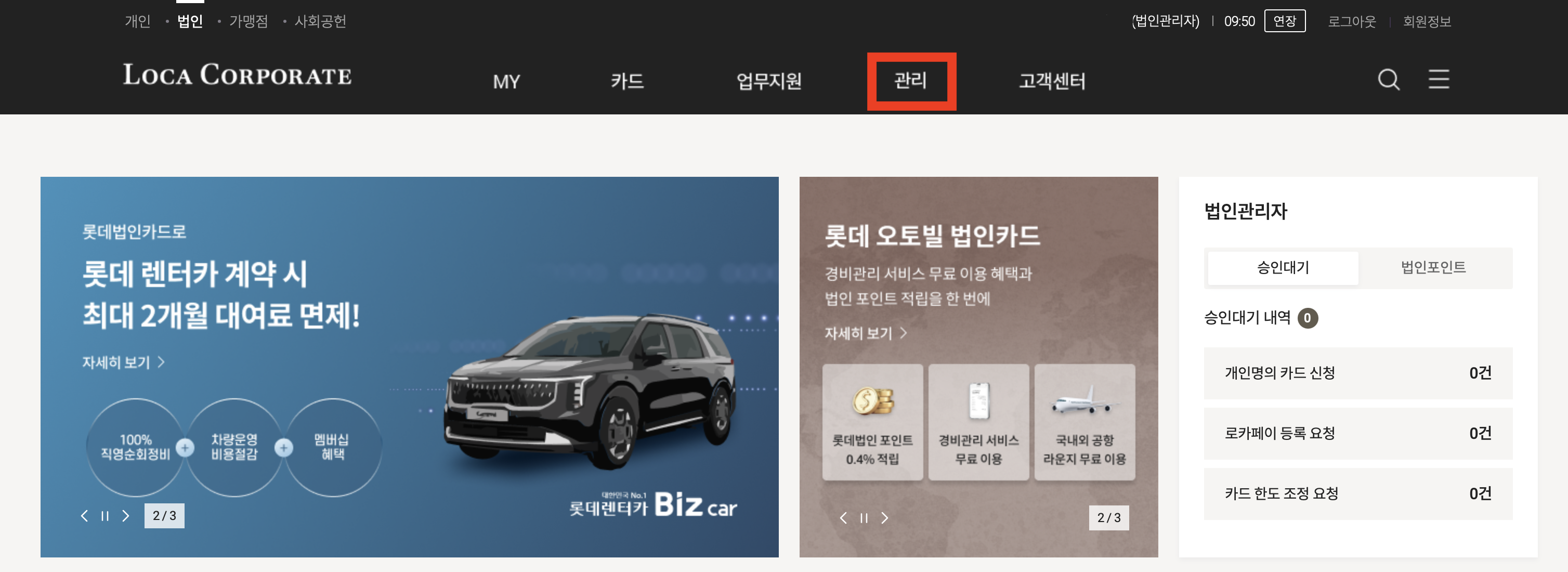 step 1. 롯데카드 법인 홈페이지 접속 → 총괄관리자로 로그인