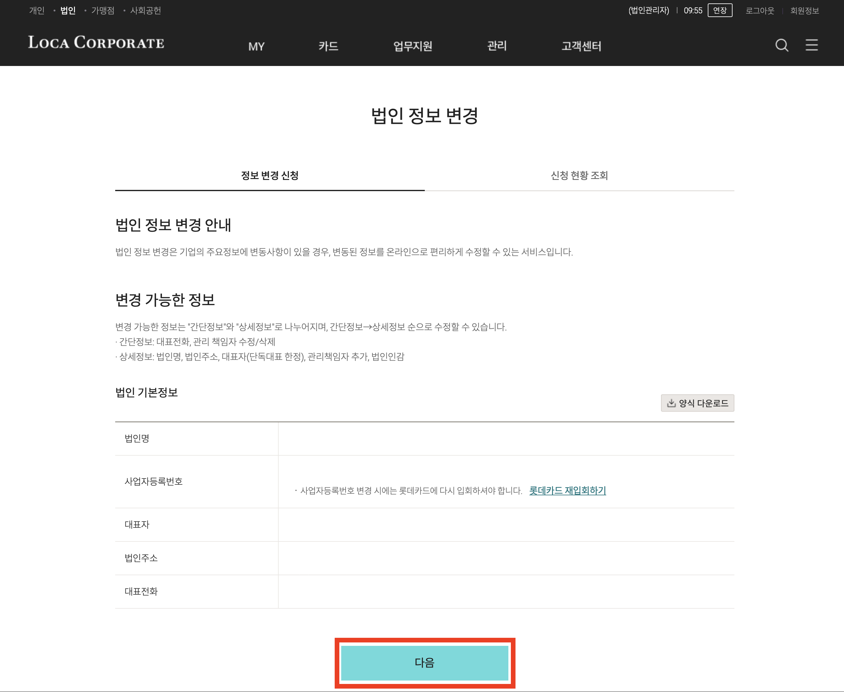 step 4. [정보 변경 신청] 페이지 하단에 [다음]버튼 클릭 후, 변경 정보 수정