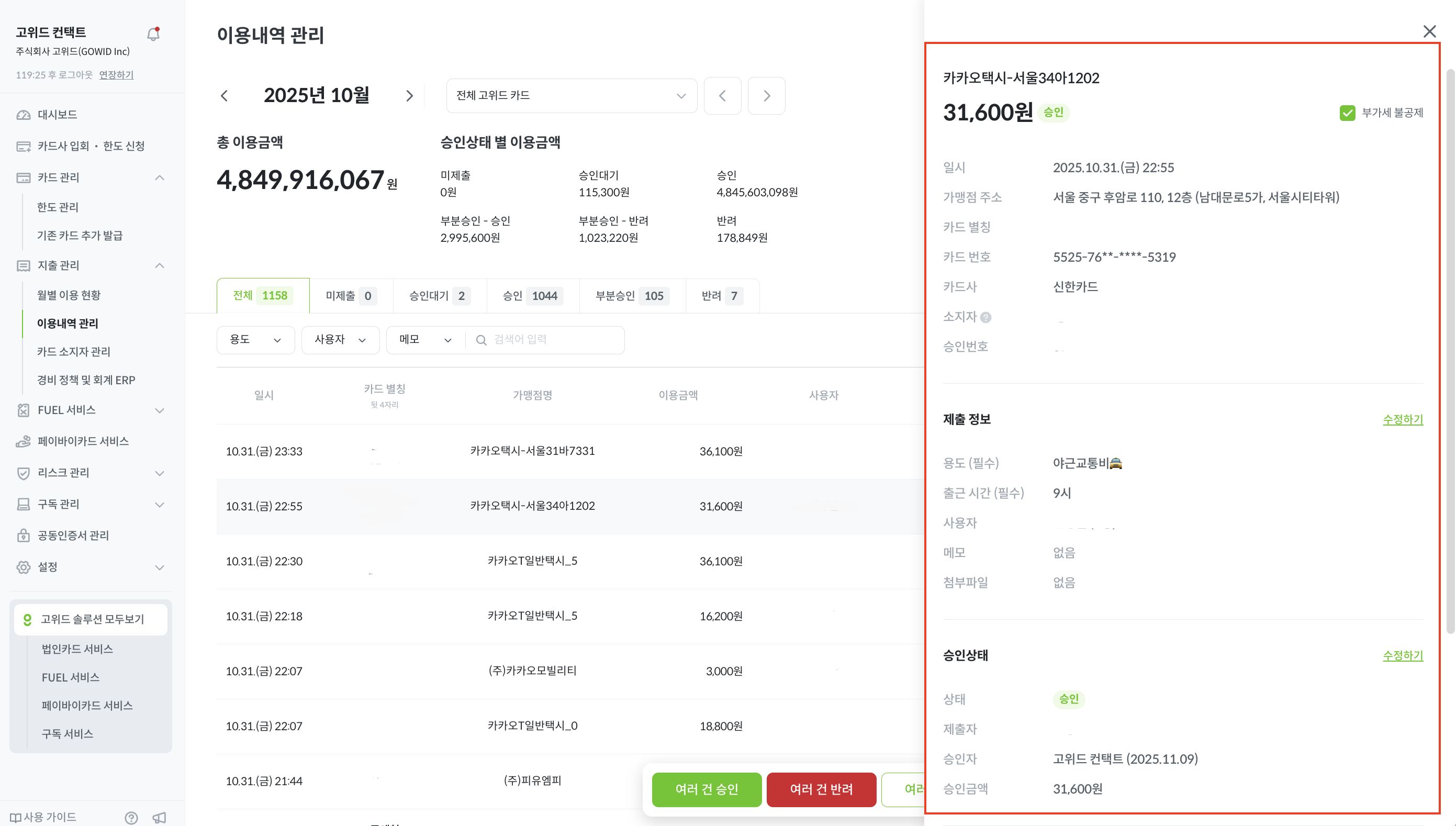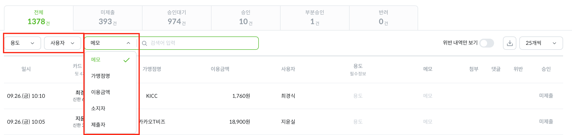 또한 특정 카드의 이용내역을 용도별, 사용자별로 구분하여 볼 수 있으며, 내역 리스트에서 특정 이용 내역을 클릭하면 가맹점명, 가맹점 주소, 메모 및 첨부 파일 등 상세 정보를 모두 확인하실 수 있습니다.