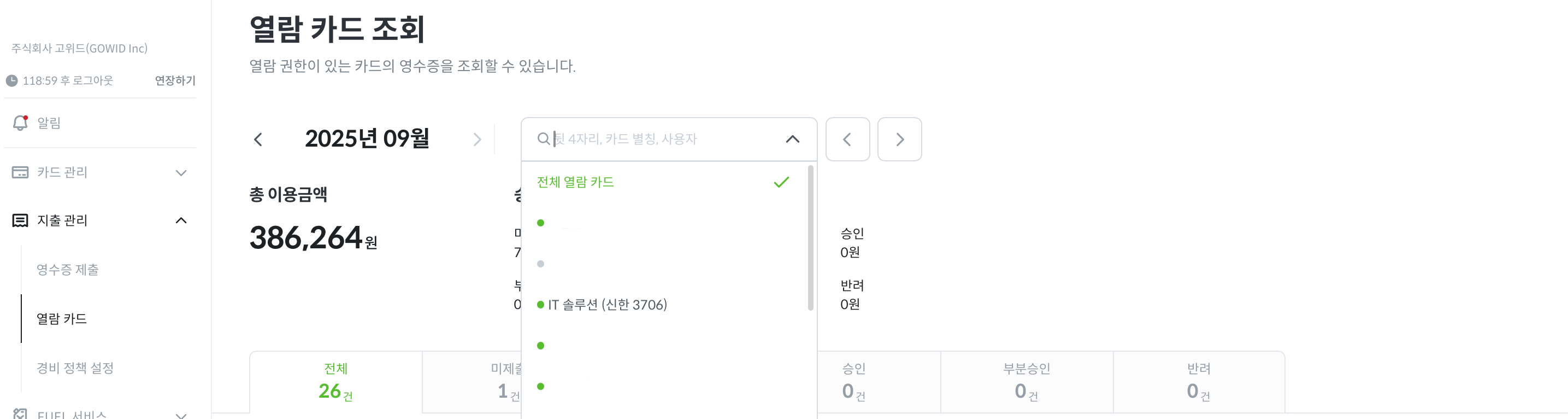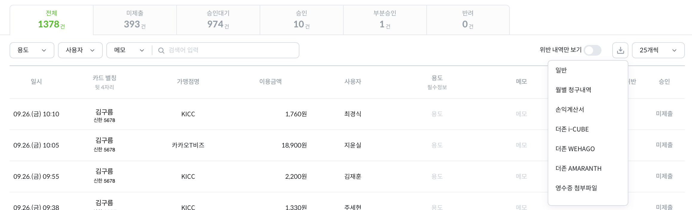 부서 카드 관리자 및 일반 멤버는 [이용내역 관리]가 아닌 [영수증 제출] 탭에서 확인 가능합니다.
