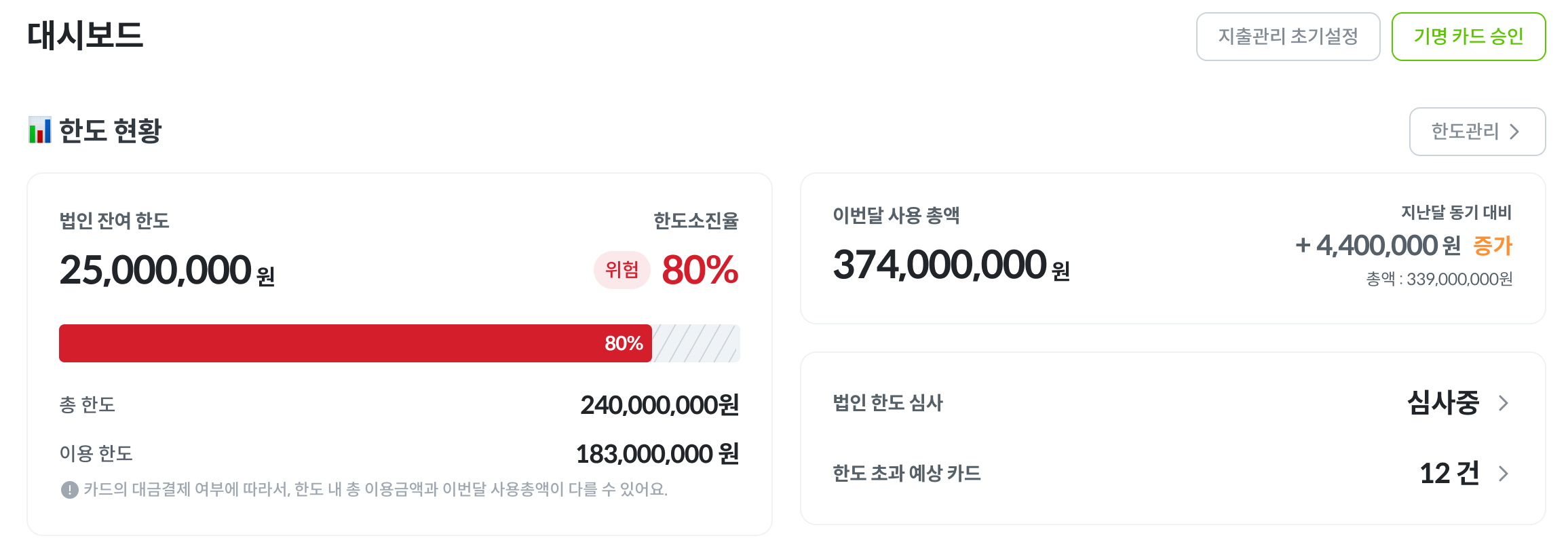법인이 사용 가능한 총 한도를 한 눈에 확인할 수 있습니다.