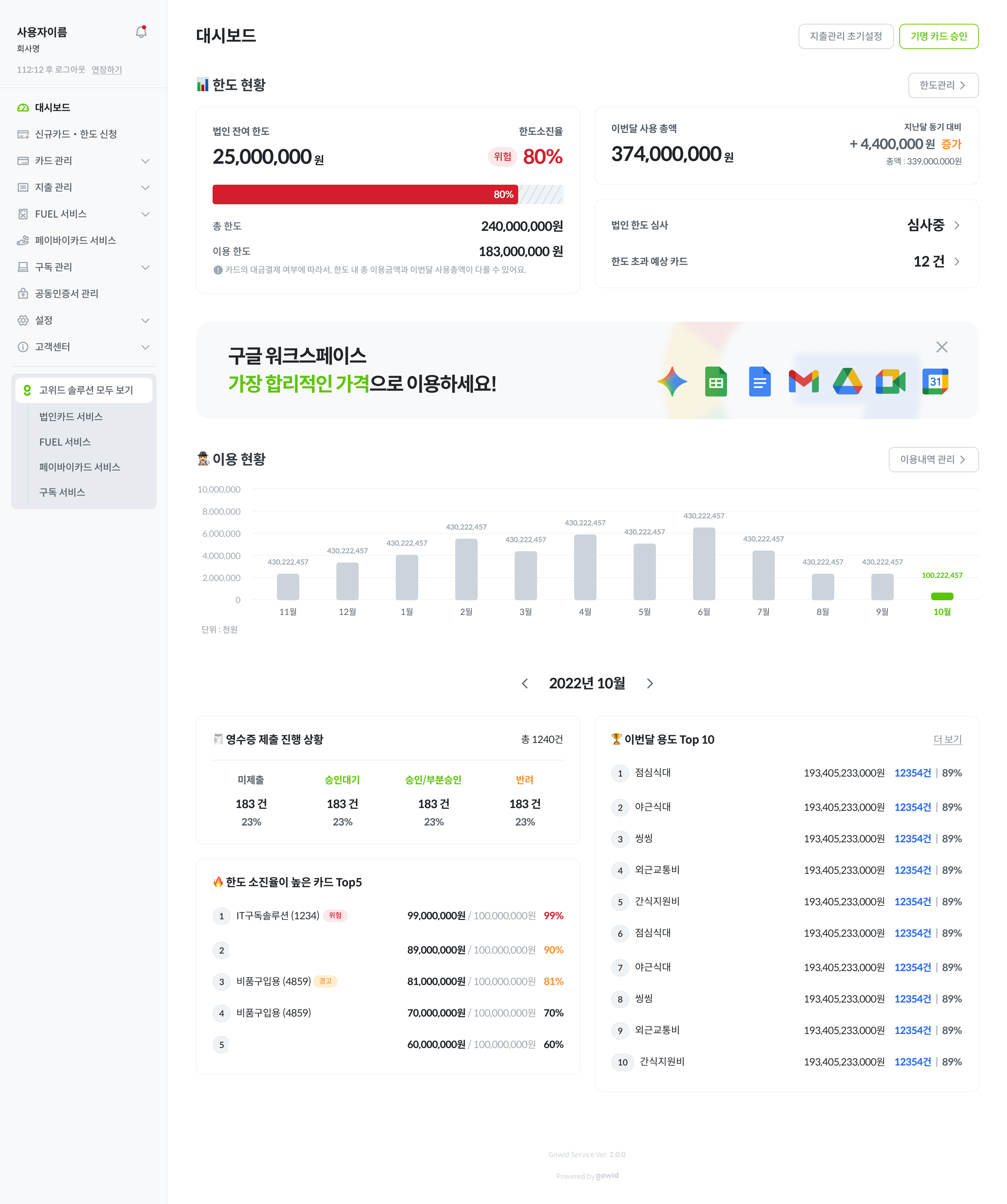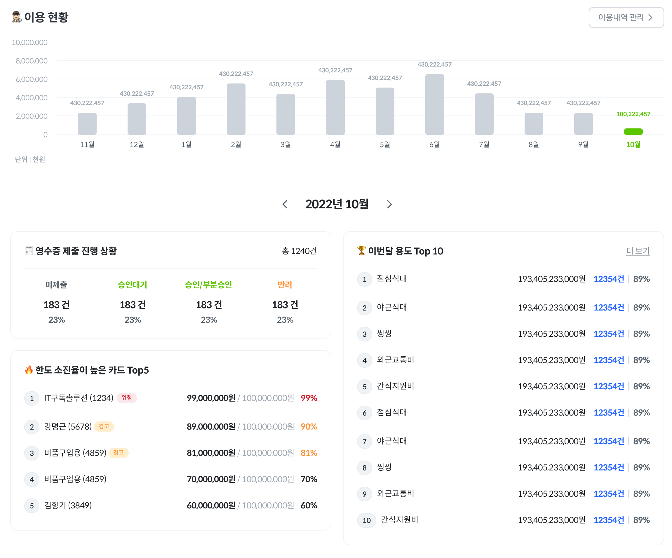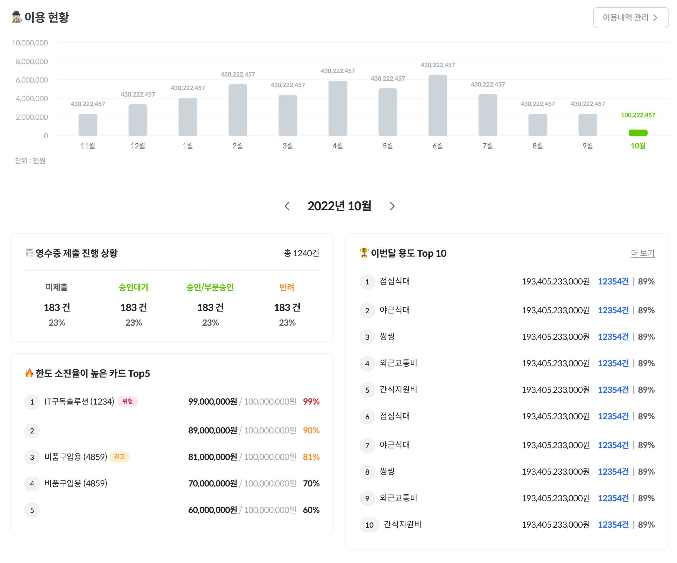 [한도 소진율이 높은 카드 Top5], [이번달 용도 Top 10]에서