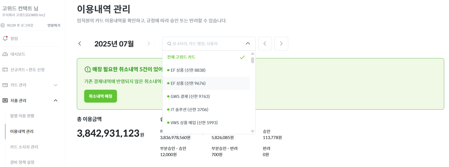 이번 달 법인카드로 사용한 총액을 지난 달과 비교할 수 있습니다.