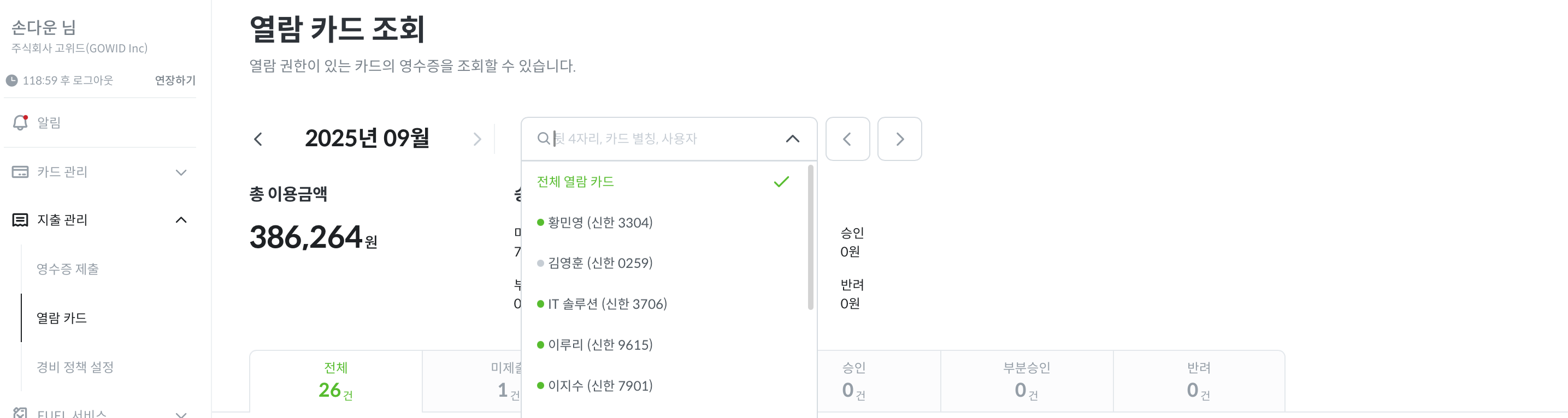영수증 제출 진행 현황에서 임직원의 제출 현황을 확인하고 관리할 수 있습니다.