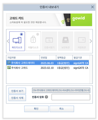 삭제 즉시 고위드 내 인증서 정보는 삭제되며, 인증서 정보는 더이상 수집되지 않습니다.