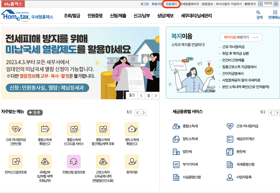 홈택스(https://www.hometax.go.kr)에 로그인 하시고 오른쪽 상단에 인증센터를 클릭합니다.