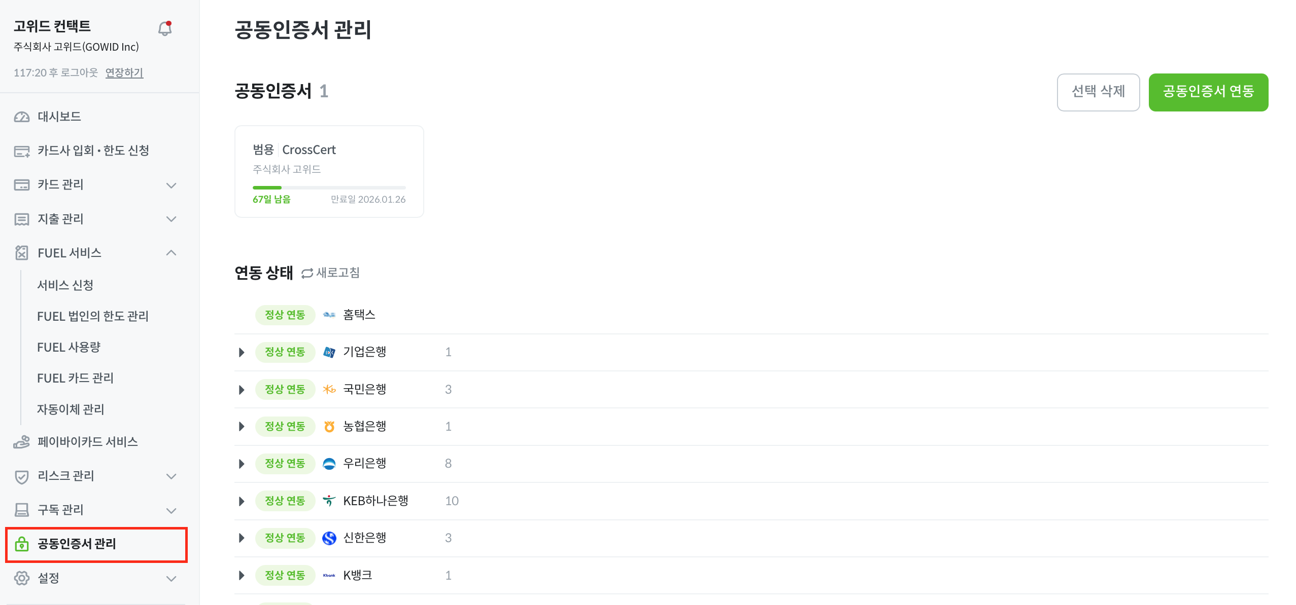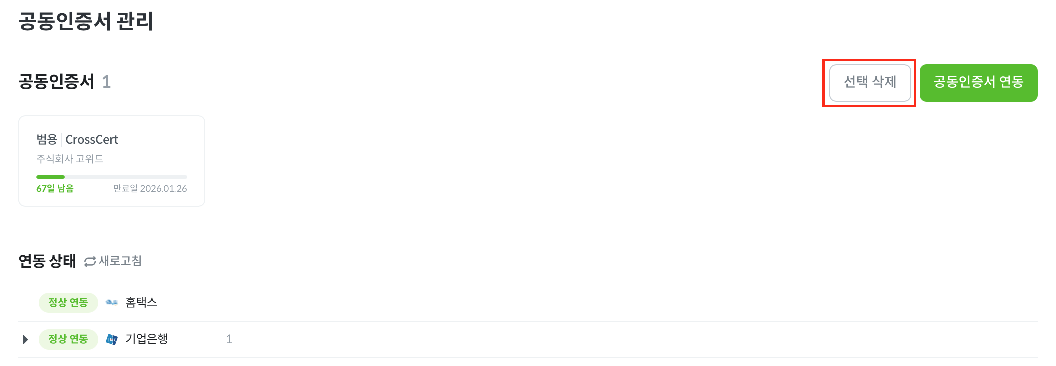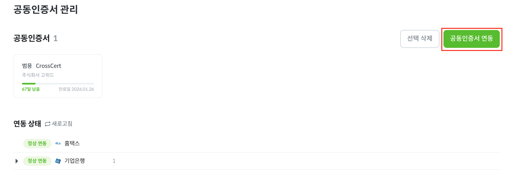 연동된 공동인증서가 모두 ‘만료’ 상태이거나 만료 기간이 1달 이내로 남은 경우, 아래 [공동인증서 관리] 페이지에서 갱신을 진행해주셔야 합니다.