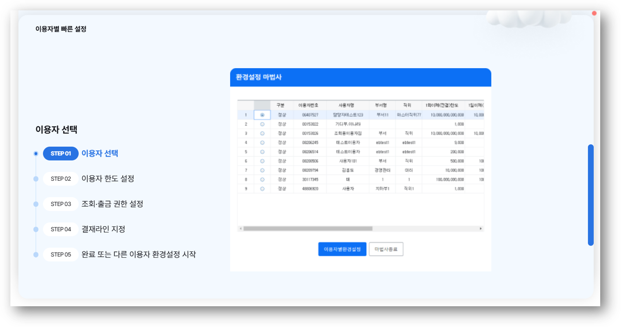이용자 선택에 들어가서 [이용자별 환경 설정]을 클릭해주세요.