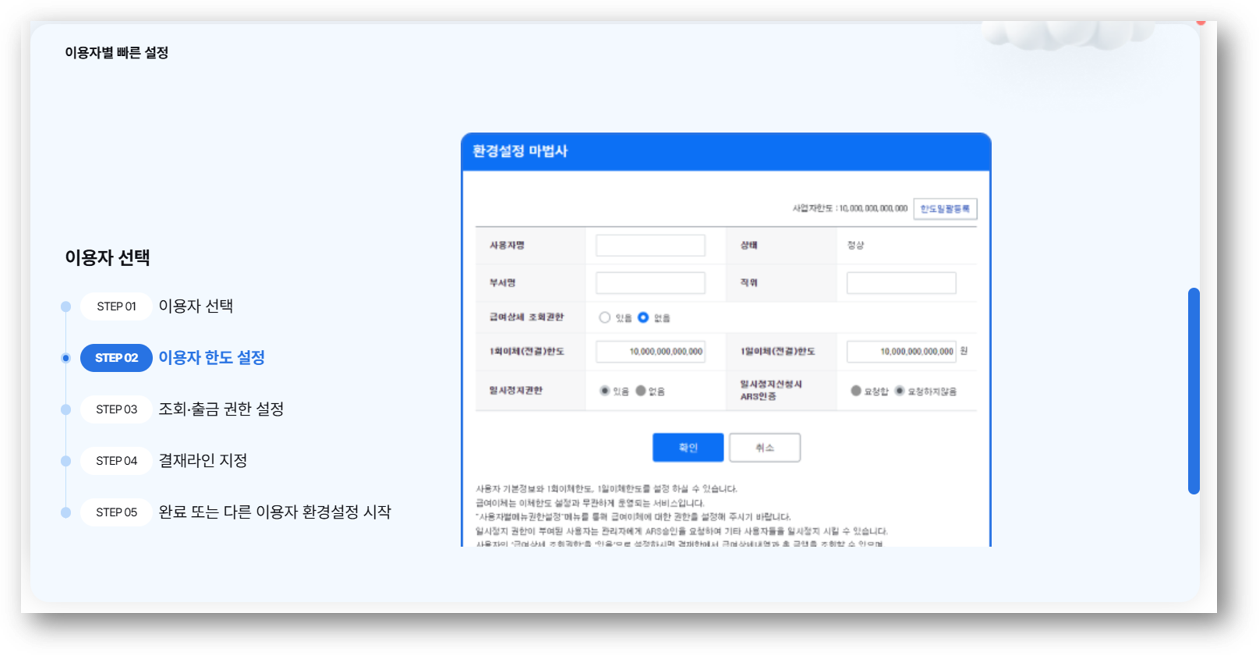 이용자 한도 설정을 진행해주세요. 관련한 문의사항이 있으실 경우 기업은행 고객센터 1588-9999 로 문의하여 주세요.