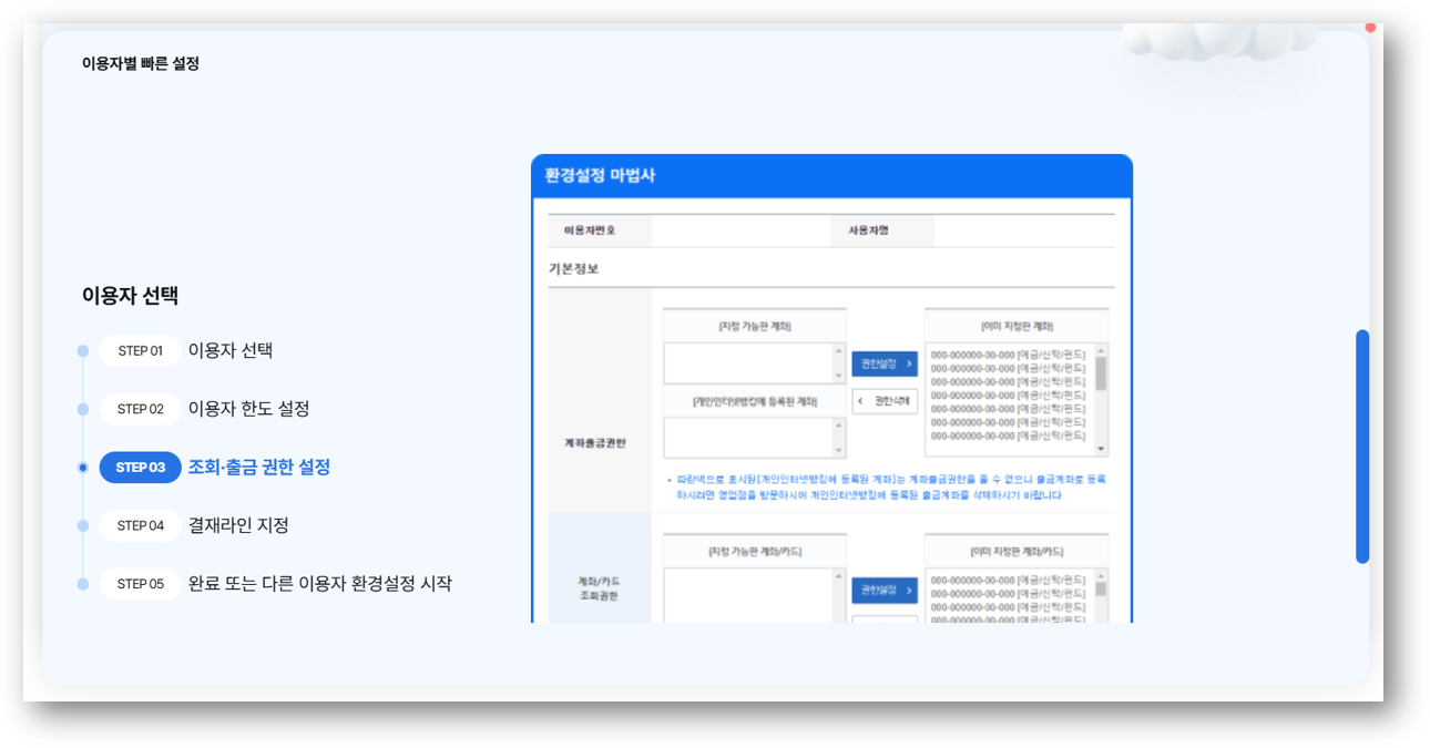 조회, 출금 권한 설정에서 권한 설정을 모두 [이미 지정한 계좌]로 넘겨주시길 바랍니다.