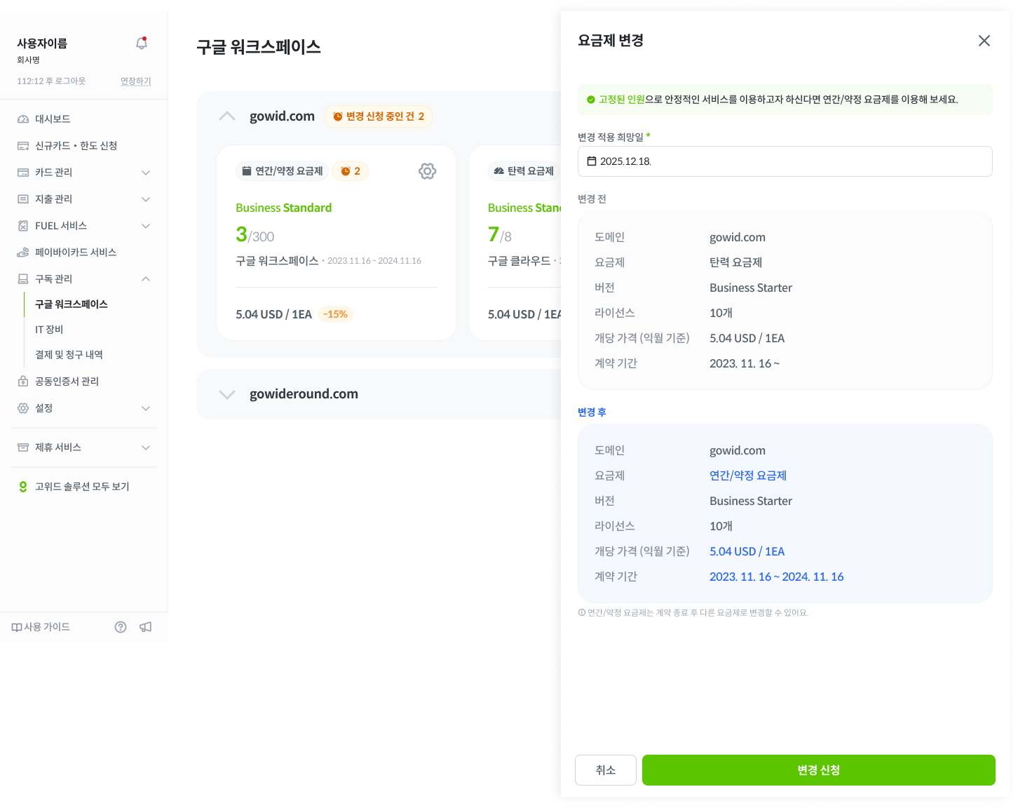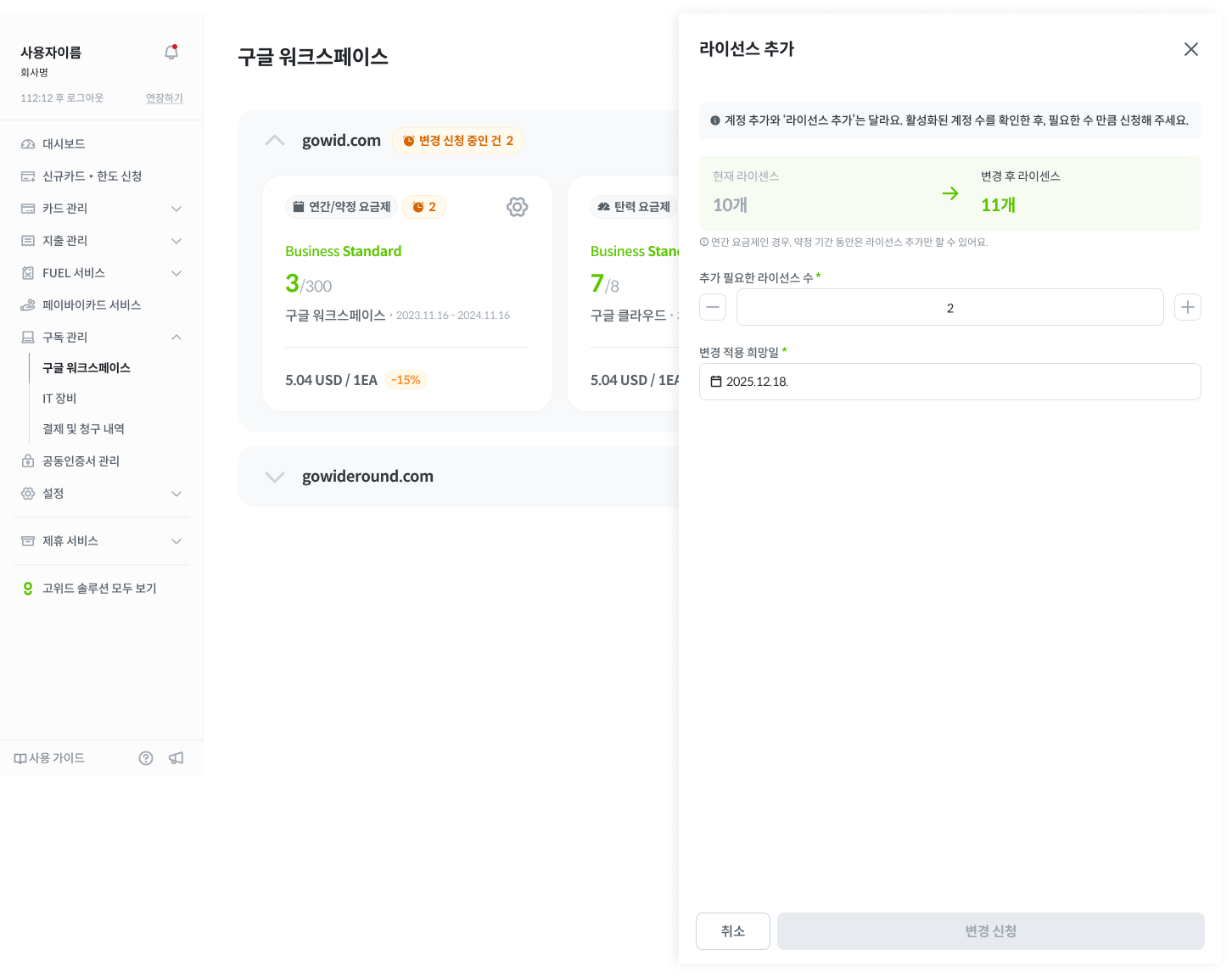 ⚙️ [설정 아이콘] > [라이선스 추가] 클릭 후 변경 적용 희망일을 신청해주세요.