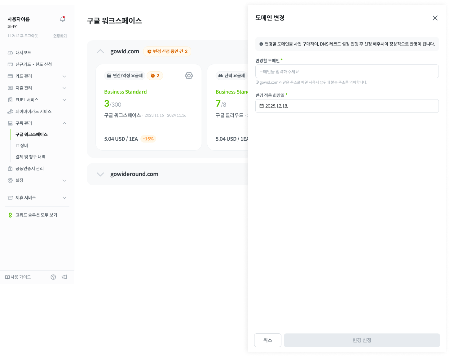 [설정 아이콘] > [도메인 변경] 클릭 후 변경 적용 희망일을 신청해주세요