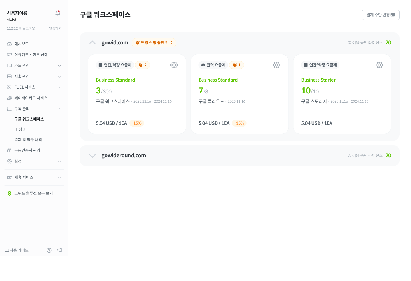 요금제 : 현재 이용 중인 플랜(예: Business Standard)을 바로 확인할 수 있습니다.