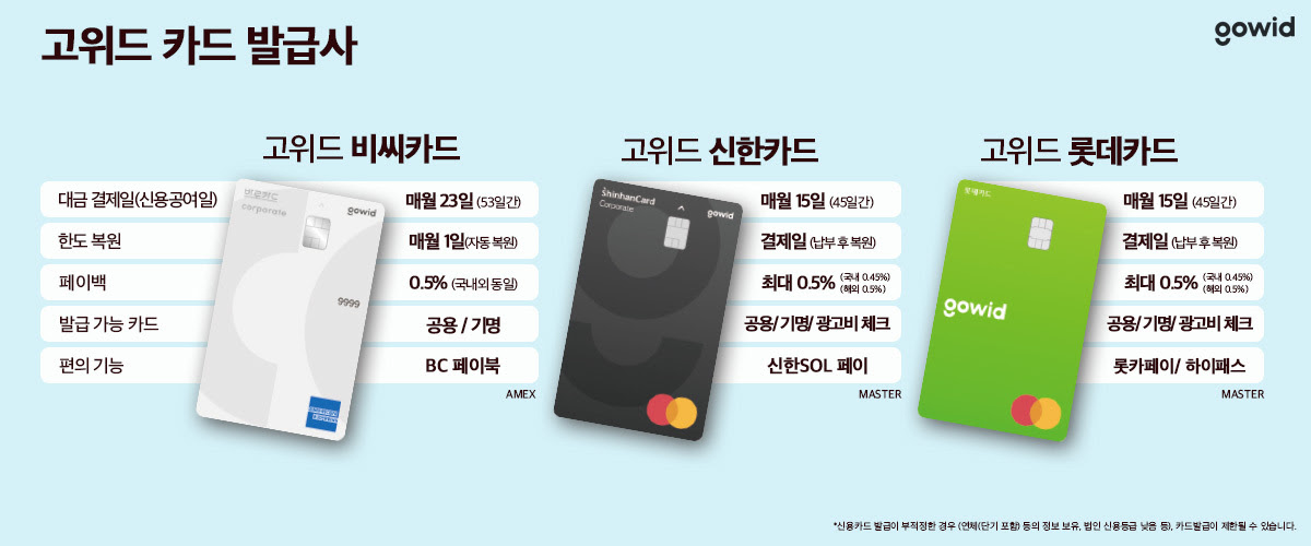 고위드 법인카드는 신한카드, BC카드, 롯데카드를 제공하고 있으며, 각 카드사의 스펙을 확인해보세요.