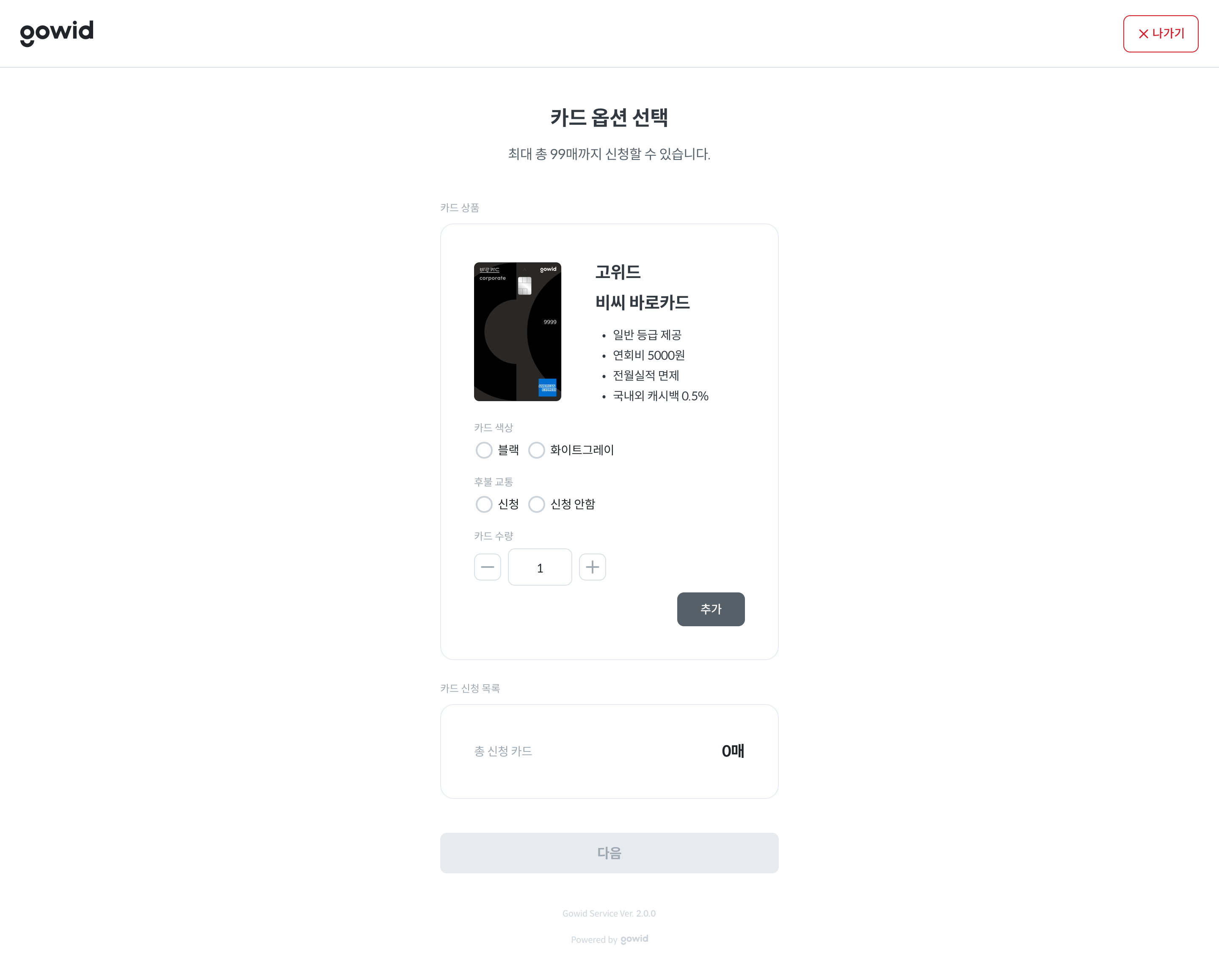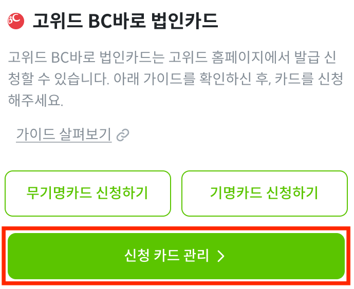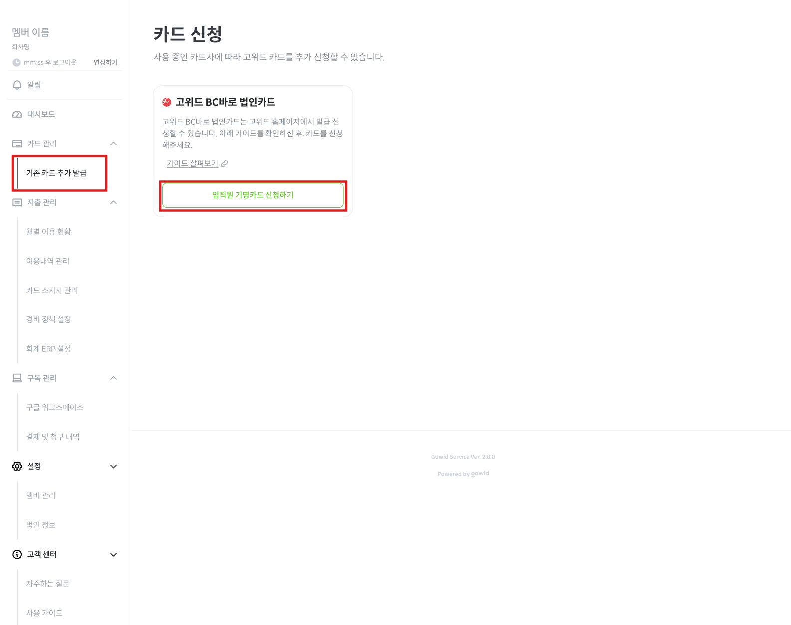 고위드 BC바로 법인카드는 고위드 홈페이지에서만 추가 발급이 가능합니다.