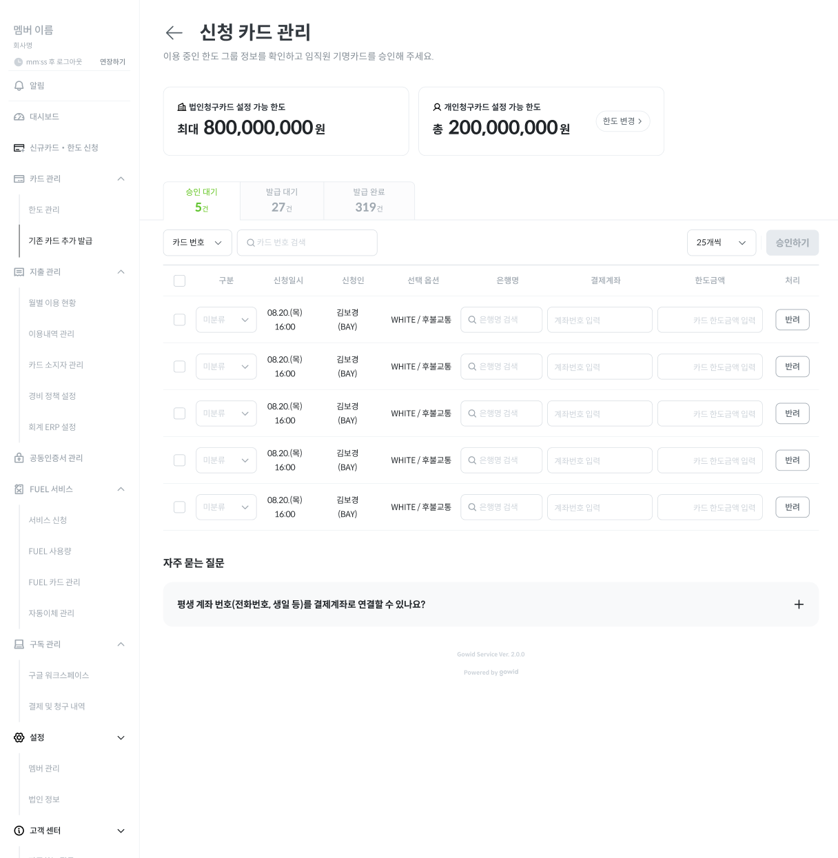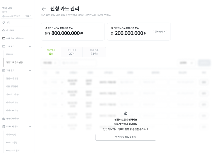 슈퍼관리자가 [카드 관리] → [기존 카드 추가 발급] → [신청 카드 관리]에서 기명카드를 승인합니다.