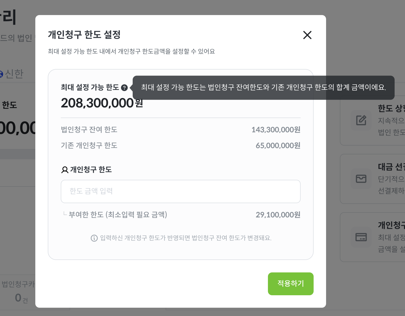 설정 후 [한도 관리]에서 ‘법인청구 잔여 한도’와 ‘개인청구 잔여 한도’가 잘 바뀌었는지 확인해보세요.