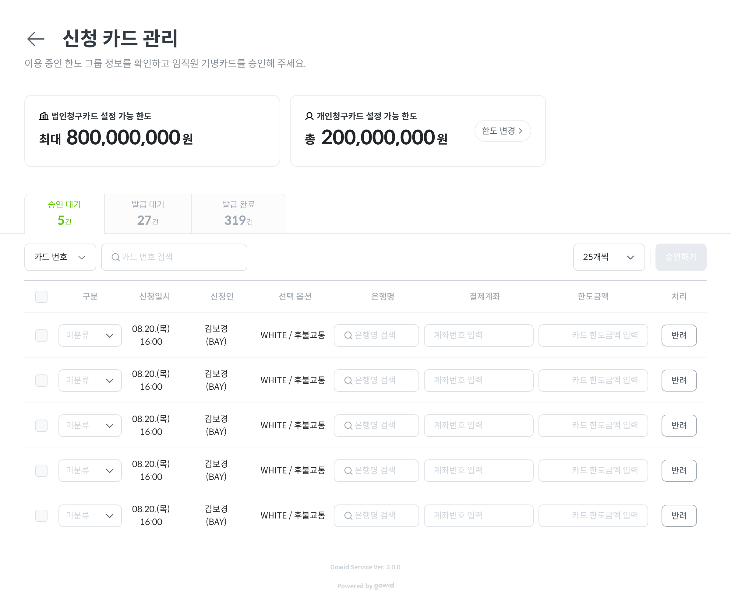 *임직원의 기명카드 신청 건은 슈퍼 관리자가 승인까지 완료해야 카드사로 최종 접수됩니다.