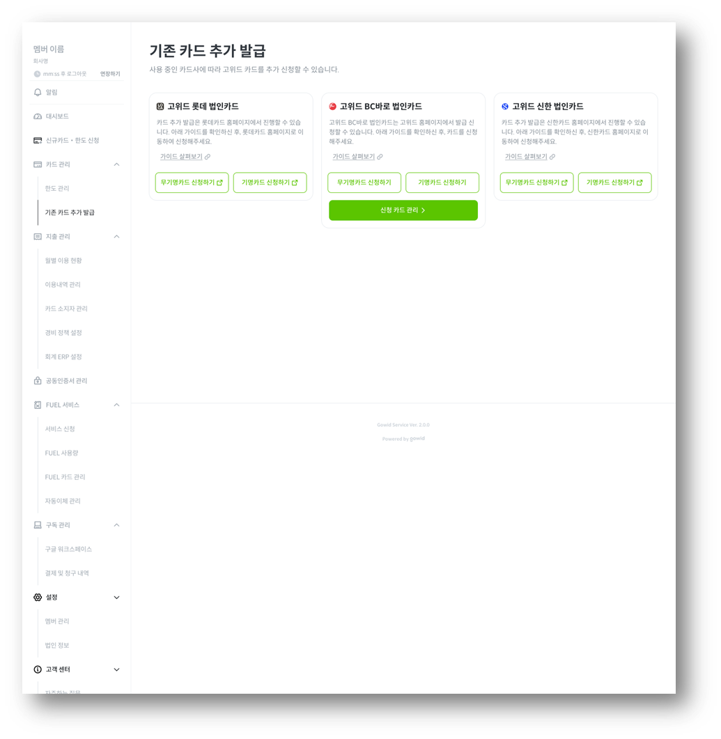 현재 고위드 BC바로 법인카드만 고위드 홈페이지에서 추가 발급 가능하며, 고위드 신한/롯데 법인카드는 카드사 홈페이지에서 추가 발급 신청해주셔야 합니다.