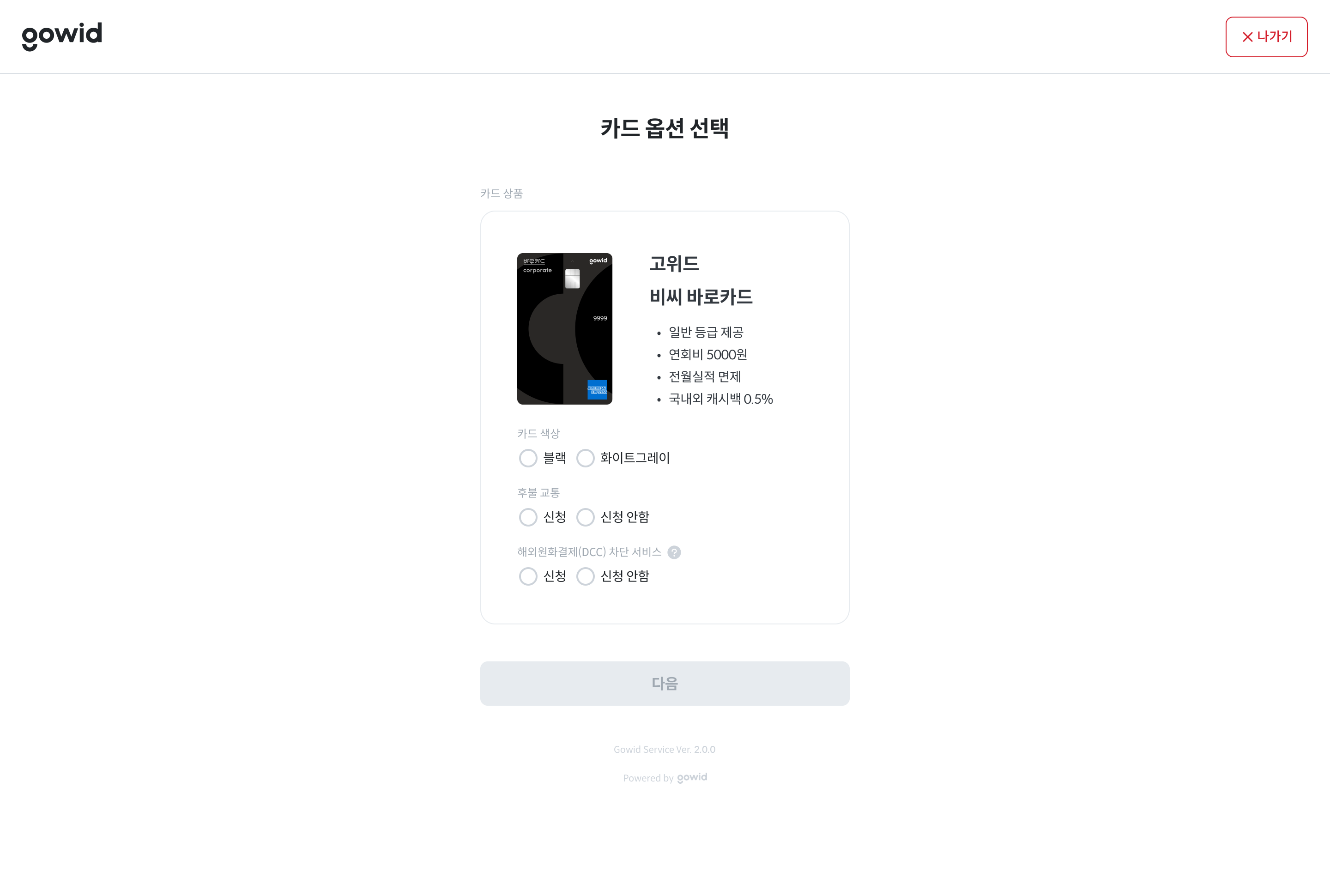 카드 색상, 후불 교통, 해외원화결제 차단 서비스 신청 여부 등 카드 옵션을 선택해주세요.