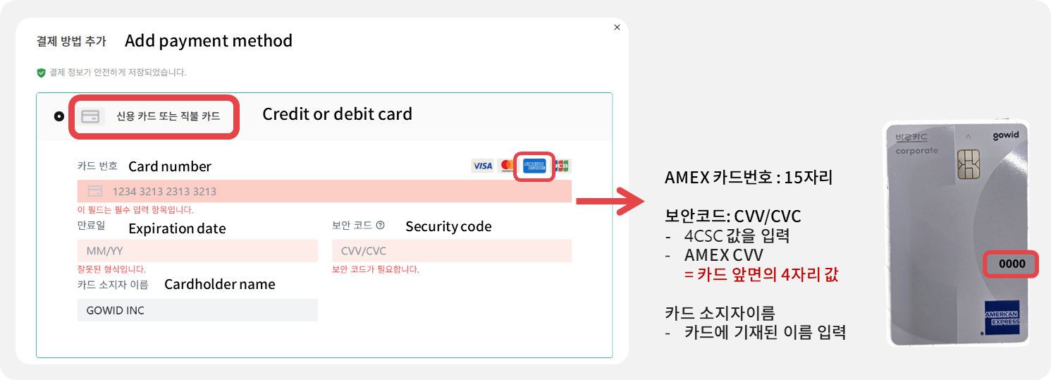 • 카드 등록 시 credit or debit card 가 확인되신다면, 카드번호 15자리, 보안코드 카드 앞면의 4자리 값을 입력해주세요.