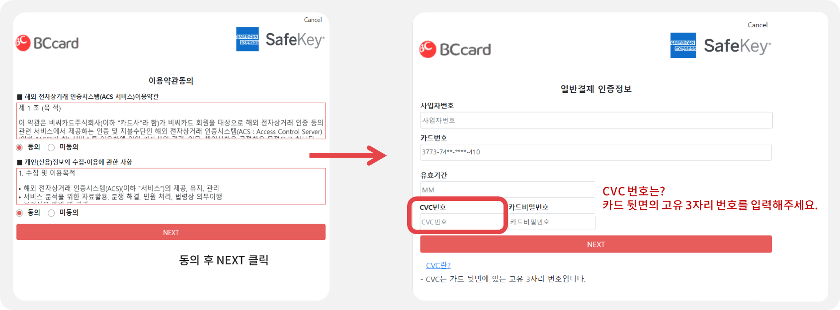 • 아멕스에서 제공하는 safekey 단계로, 동의 후 사업자번호, 유효기간, CVC번호, 카드비밀번호를 입력해주세요.
