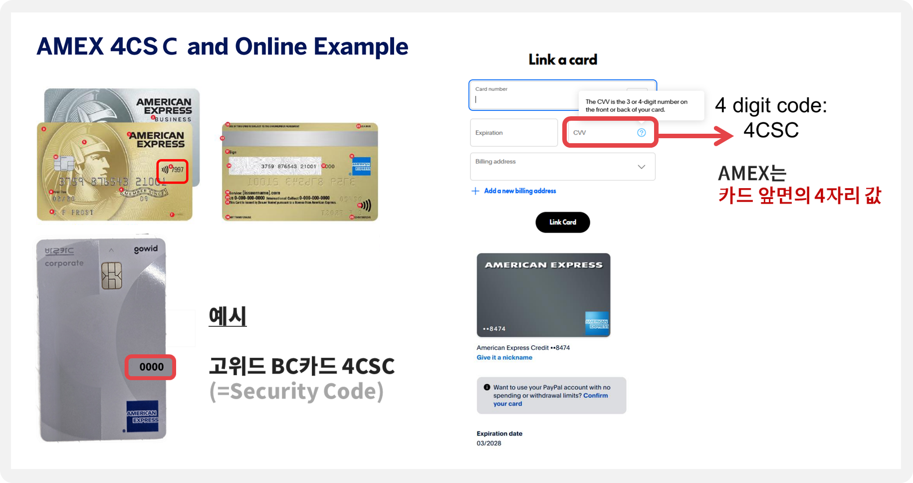 익숙한 MasterCard 가 아니라, 아멕스(AMEX) 상품이라 결제 오류가 발생할 수 있습니다. 안내 드리는 Security Code, CVC번호 등 차이에 대해 참고하셔서 진행해주세요.