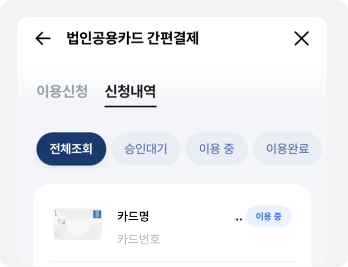 위 단계까지 완료되었다면, 페이북 결제 내 [법인공용카드 간편결제] - [신청내역] 에서 추가한 카드가