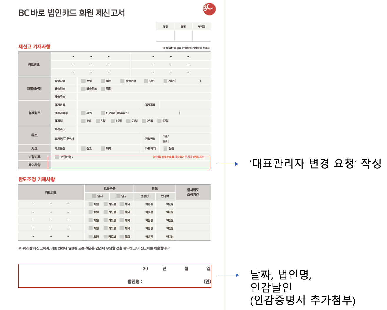 1. 아래 BC카드 제신고서 PDF 양식을 다운로드 받으신 후, 아래 가이드에 따라 작성해주세요.