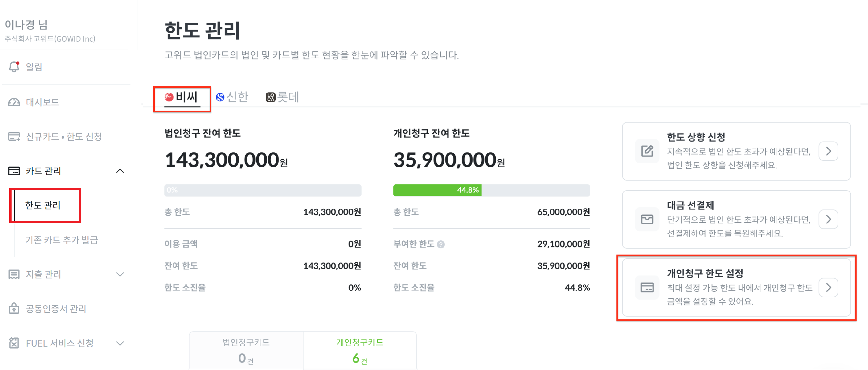 [비씨] 카드한도 설정 및 법인/개인청구 잔여한도