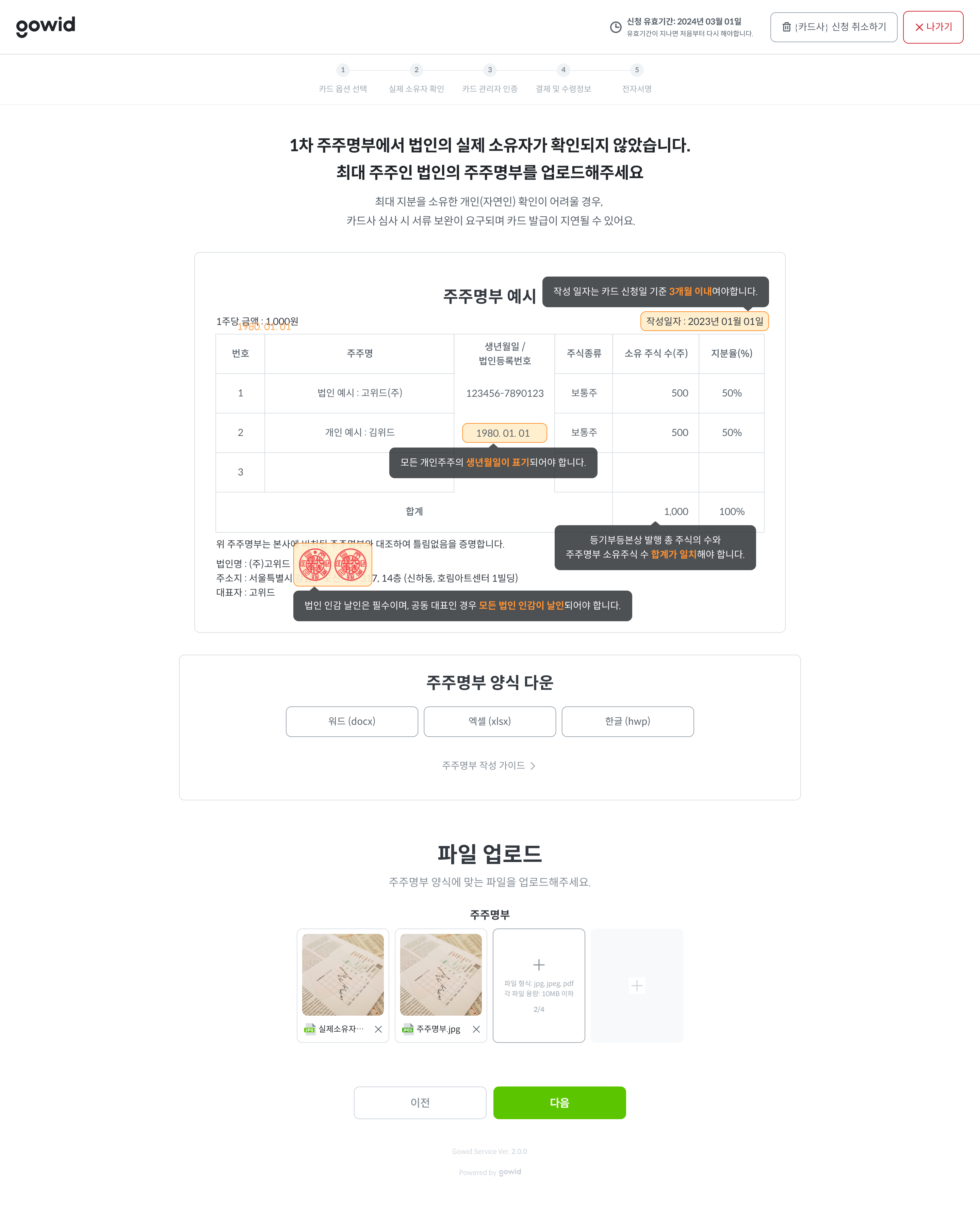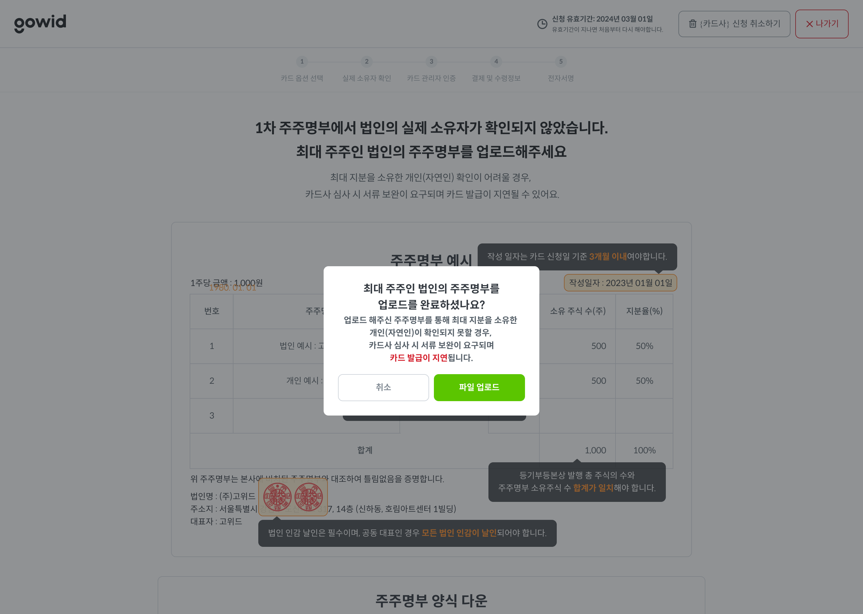 차후 카드사 심사 시 실제소유자확인서에서 보완이 필요할 경우, 서류 보완 후 카드 발급이 재진행되기 때문에 수령 예상 시기보다 다소 지연될 수 있음을 안내드립니다.