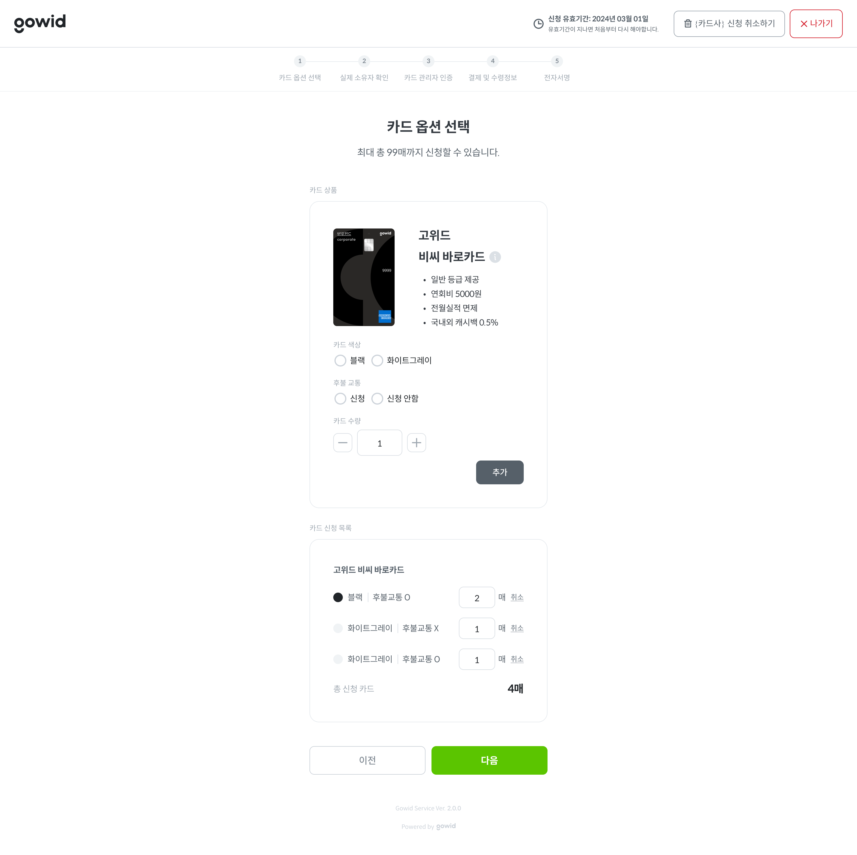 원하시는 카드 색상, 후불 교통 여부, 카드 수량 선택해 주시기 바랍니다.