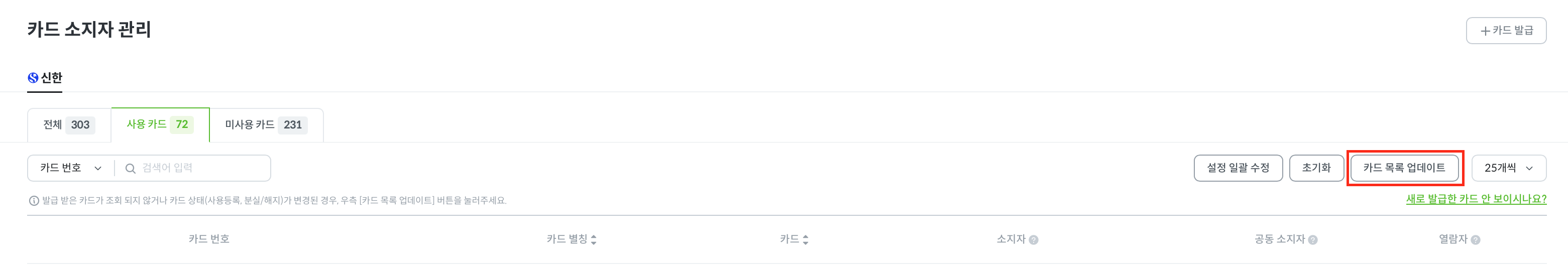 오른쪽 상단 [카드 목록 업데이트] 버튼 클릭
